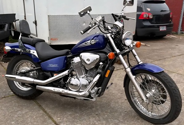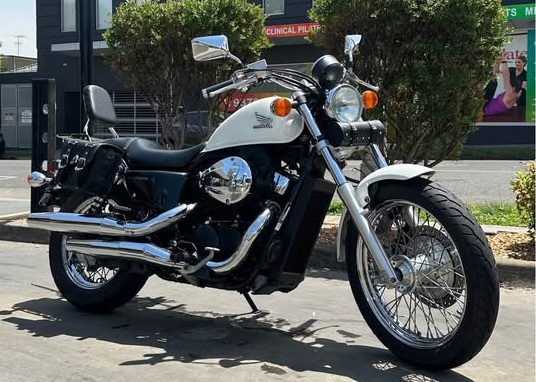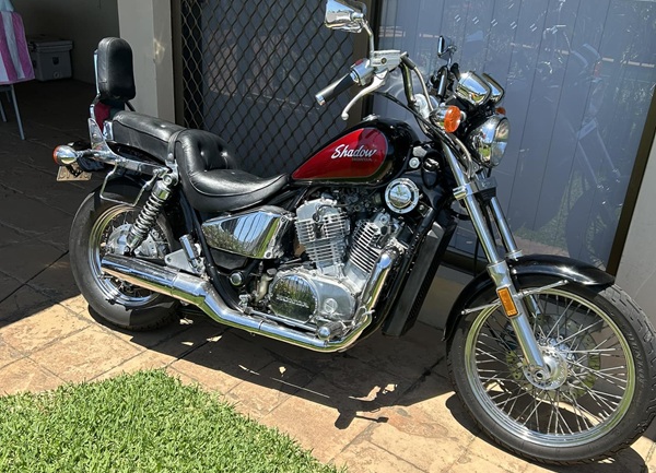 The “VLX” “Shadow 600” (aka “VT600C”) was introduced as a new model in 1988. It has a single shock rear suspension, a low 27.1-inch (690 mm) seat height and a long 63.2 inches (1,610 mm) wheelbase with a 2.4 US gallons (9.1 L; 2.0 imp gal) fuel tank. The engine is a 583 cc (35.6 cu in) SOHC three-valve liquid cooled 52-degree V-Twin that averaged 49.5MPG and unlike prior models this engine utilized a shared crankpin to have a more Harley Davidson-like sound & shake thus generating a low 39HP @6,500rpm and 36 ft-Ib of torque @3,500RPM connected to a four-speed transmission and chain drive. In 1999 the dual Keihin CV carburetors were replaced by a single vertical Keihin CV carburetor more like the single carbs found on Harley Davidsons via different heads and a special intake manifold again like many Harley Davidsons, this further reduced horsepower from 39 hp down to 35 hp.
